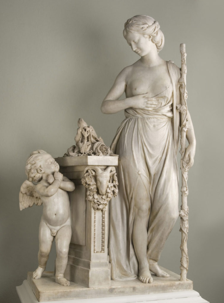 A sulking Cupid has laid his arrows on a sacrifice, while Friendship (personified as a young woman) looks on approvingly.